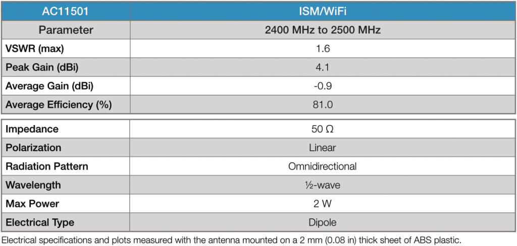 The AC11501 flexible printed circuit (FPC) antenna supports the 2.4 GHz industrial scientific and medical (ISM) band (2400 MHz to 2500 MHz), serving a multitude of Internet of Things (IoT) applications.