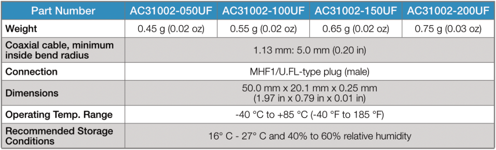 The flexibility and peel-and-stick adhesive backing make the AC31002 antenna easy to mount in unique and custom enclosures. Connection is made to the radio via a 1.13 mm coaxial cable terminated in a U.FL-type plug connector. Various cable length options are available (See Ordering Information).