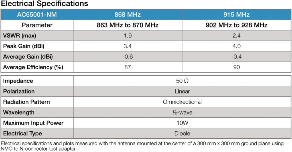 The AC65001-NM NMO-connector dome antennas provide robust compact, outdoor, omnidirectional cellular antenna solutions for 868 MHz and 915 MHz ISM applications including LoRaWAN® and WiFi HaLow™. Each antenna supports IP67 and IP65 ingress protection as well as IK-10 impact resistance, all under an attractive, UV-resistant, dome. The 82 mm x 40mm mounted size combines excellent antenna performance with a compact low-profile that fits in many applications from mobile/vehicular roof-mount to fixed vending machine use, and supports use on both metal enclosures or in free space including non-metallic enclosures.
