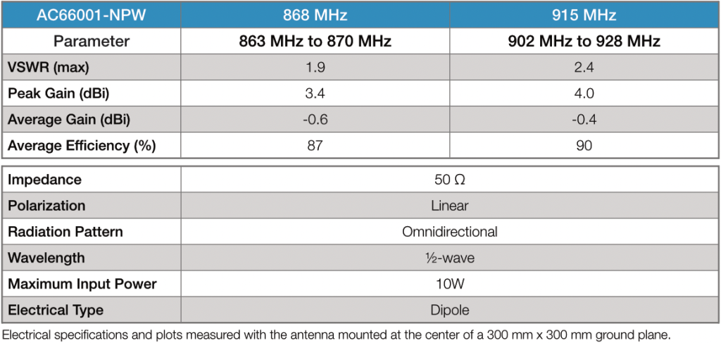 The AC65001-NJ series N-connector dome antennas provide robust compact, outdoor, omnidirectional cellular antenna solutions for 868 MHz and 915 MHz ISM applications including LoRaWAN® and WiFi HaLow™. Each antenna supports IP67 and IP65 ingress protection as well as IK-10 impact resistance, all under an attractive, UV-resistant, dome. The 82 mm x 40mm mounted size combines excellent antenna performance with a compact low-profile that fits in many applications from mobile/vehicular roof-mount to fixed vending machine use, and supports use on both metal enclosures or in free space including non-metallic enclosures.