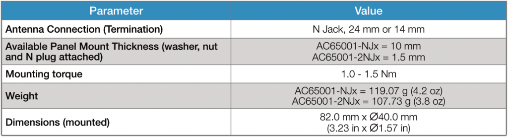 The AC65001-NJ compact dome antenna series is available in two colors, black and white, with fine matte finish, and two termination options: 24mm N-connector jack, and 14mm N-connector jack for thin/limited area mounts. Similar-performing NMO-terminated (AC65001-NM series) and cabled (AC17101 series) compact dome antennas are also available.