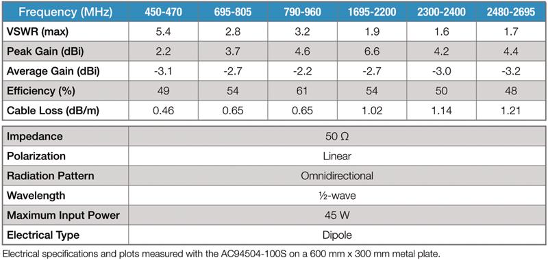 • Excellent multiband coverage including 450 MHz to 470 MHz, 698 to 960 MHz and 1700 to 2700 MHz