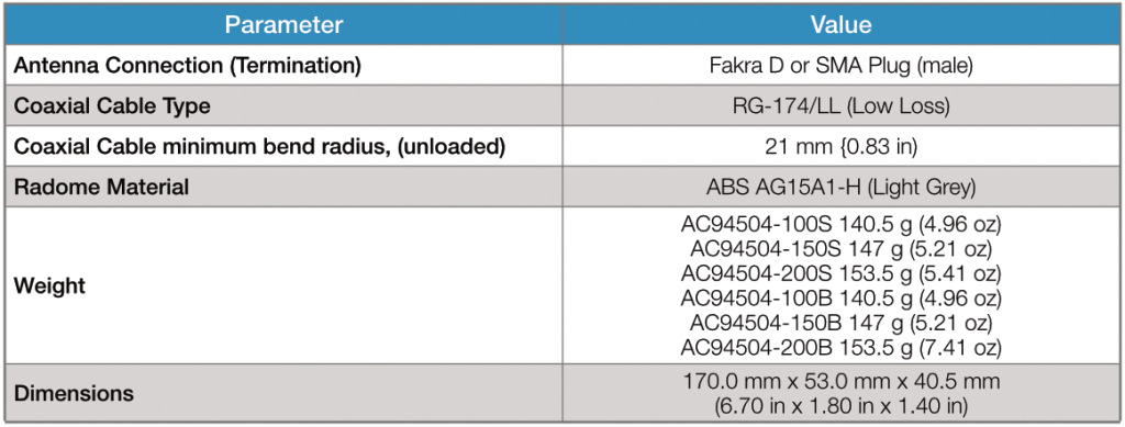 With its low-profile housing (40.5 mm) and compact footprint (53 × 170 mm), the AC94504 fits easily into electricity cabinets and tight enclosures. Its robust design offers flexible cable routing—either straight or perpendicular to the antenna base—helping to eliminate cable exposure. The peel-and-stick adhesive backing enables mounting in any desired orientation. Various cable lengths and termination options are available (see Ordering Information).